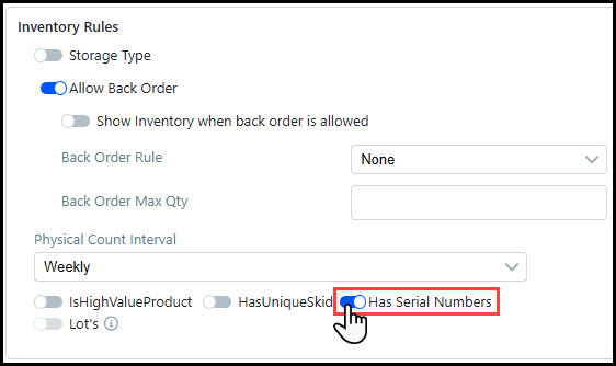 3 Enable the Has Serial Numbers setting on the Inventory tab.