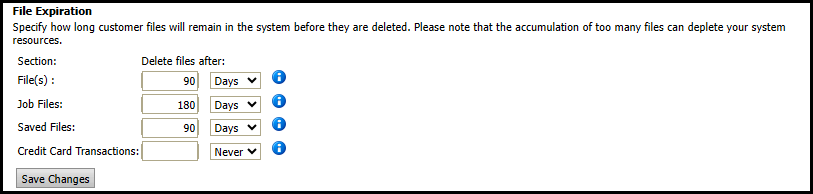 Specify how long customer-uploaded files, as well as credit card transactions, will remain in your MarketDirect StoreFront system before they are deleted. Customer uploaded files are the documents and images buyers submit when ordering a product. These files are accessible to the buyer through the My Saved Jobs and My Saved Files tabs in their account.