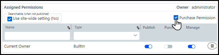 Enable or disable the Publish, Purchase, and/or Manage rights of Assigned user(s) and/or group(s) by using the appropriate toggles.